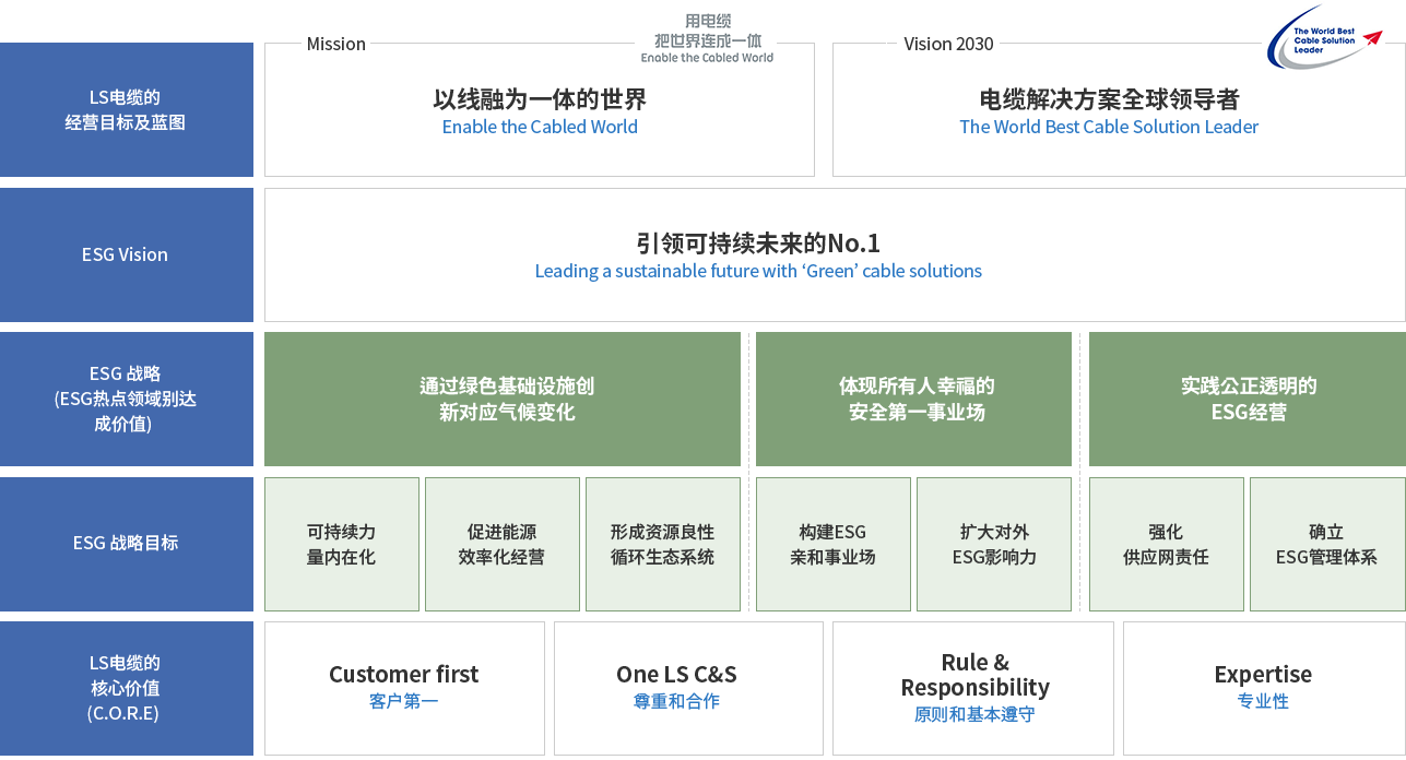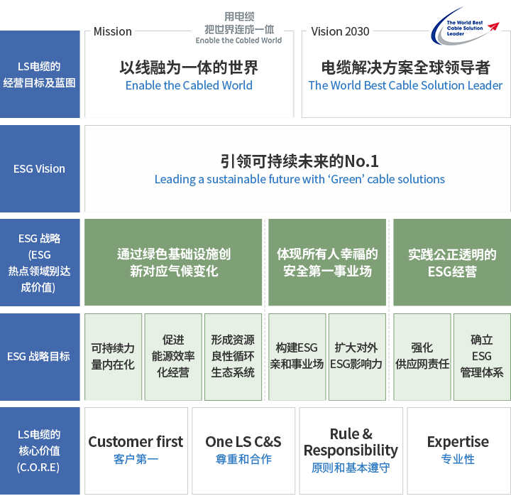 LS电缆从环境(Environment), 社会(Social), 支配结构(Governance)的侧面上,对内外部利害关系人尽到社会责任,从长期观点来看,为了公司的持续成长树立了ESG蓝图及战略体系。