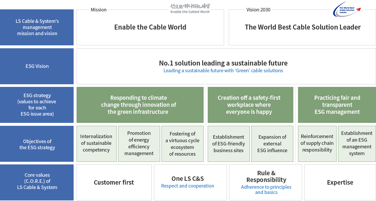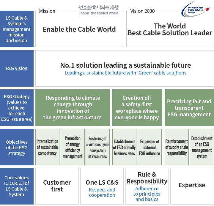 LS Cable & System has established an ESG vision and strategy system to fulfill its responsibilities to internal and external stakeholders in terms of the environmental, social and governance responsibilities, and for the sustainable growth of the company from a long-term perspective.