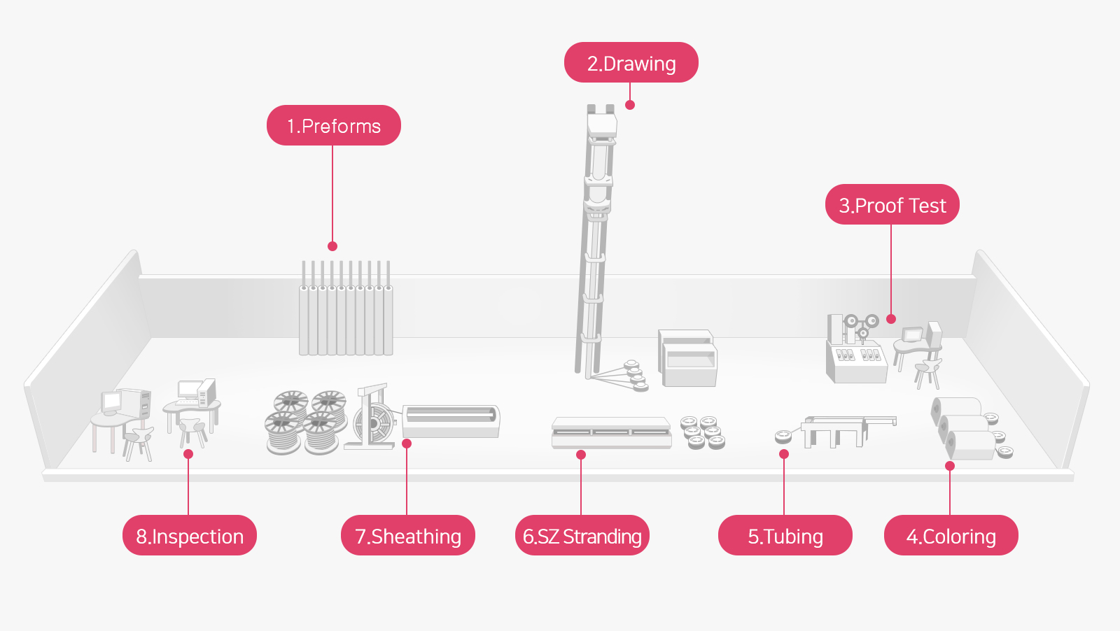 The preforms are softened in the furnace and drawn to the thin glass fiber of 125㎛ diameter. The glass fiber is coated with 245㎛ of resin for protection against moisture and external shock and then coated fiber is cured through UV oven.