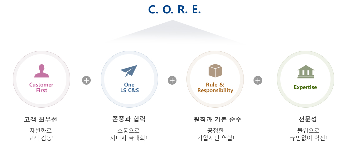 LS전선의 핵심 가치인 C.O.R.E.는 전선의 심(心). 세상의 중심(Core)인 LS전선, 전선人의 가슴속에는 핵심 가치인 C.O.R.E.가 있어야 한다는 의미입니다.