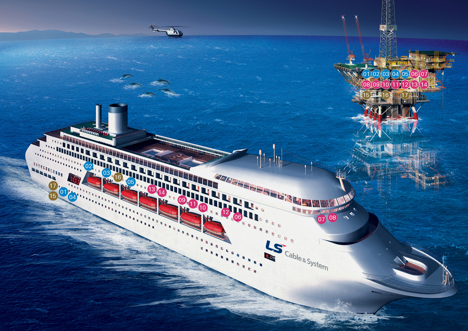 육지에서 떨어진 선박과 해양플랜트에서는 무엇보다도 효과적인 전력망과 통신망의 구축이 중요합니다. LS전선은 이를 위해 한정된 공간에서도 원활하게 전력과 통신 시스템을 구축할 수 있는 중저압 케이블과 제어 케이블, 동축 케이블 등을 선보이고 있습니다.